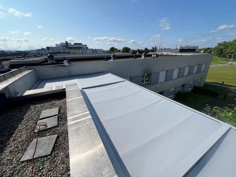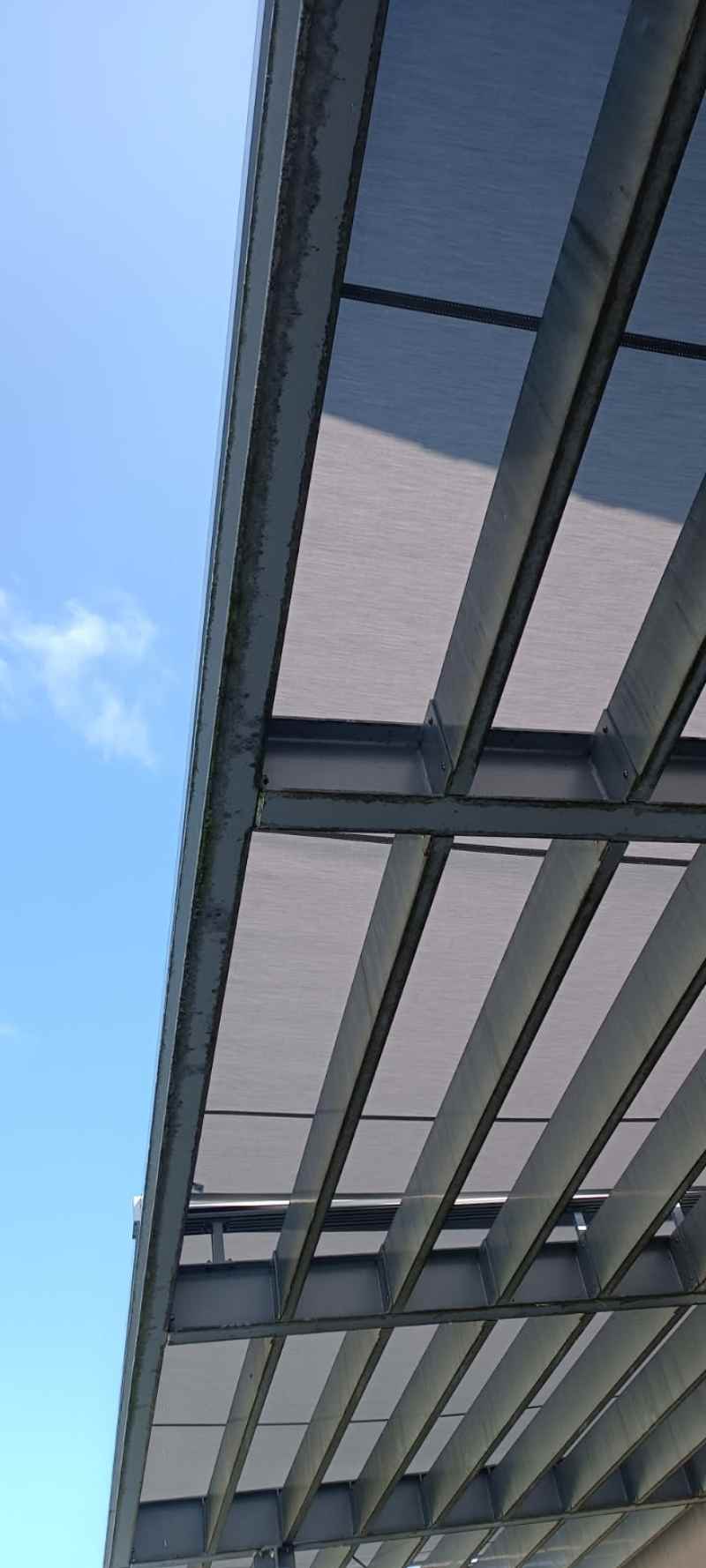 Le car port Onyx est une structure porteuse avec une toiture plate constituées de panneaux sandwich de 164 mm d’épaisseur autoportant et équipé d’une membrane EPDM assurant l’étanchéité de la toiture. On retrouve un chéneau périphérique avec sa rehausse