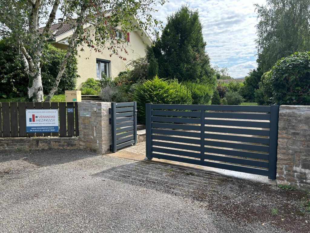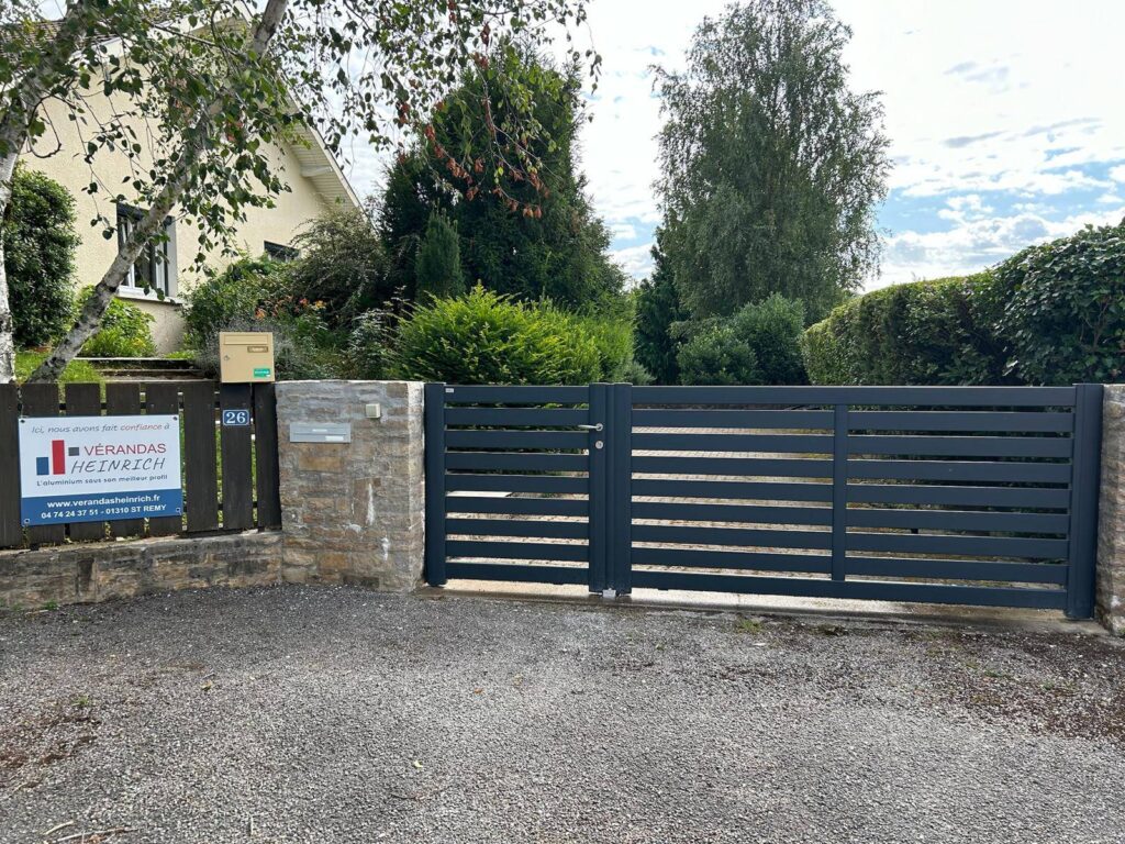 De couleur gris anthracite, il est composé de deux vantaux asymétriques. Le plus petit vantail sert aisément de portillon. L’ouverture 1/3 – 2/3 apporte une touche d’originalité à l’entrée de la propriété.