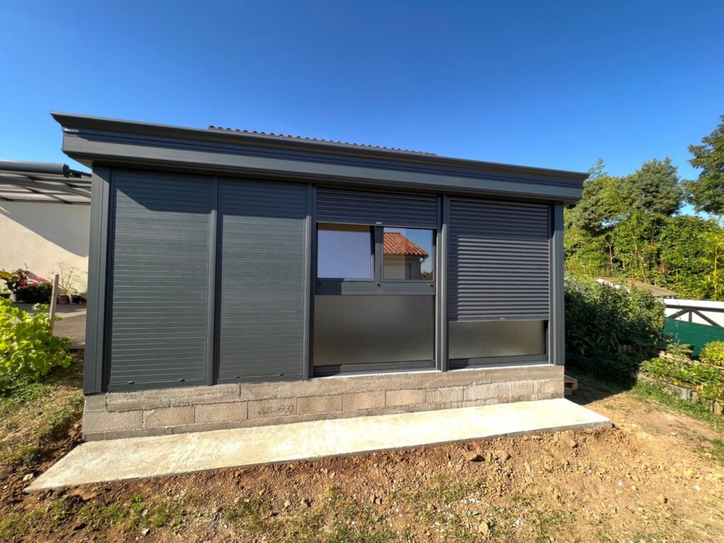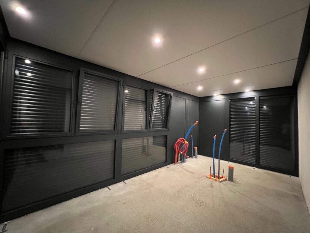 Installation d’une véranda à toit plat ONYX avec volets roulants à Val Revermont (01426)