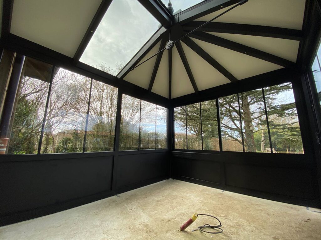 Le style victorien de la véranda VERANCO s’accorde parfaitement avec ce bâtiment ancien. Les clients souhaitaient également bénéficier d’un côté atelier industriel.