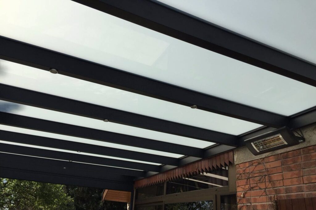 La pergola de VERANCO modèle Jade, Est une pergola à toiture plate avec du vitrage en toiture ou des panneaux isolants, un chéneau périphérique est présent sur cette pergola afin d’assurer l’écoulement des eaux prevu dans les poteaux avec une descente en PVC.