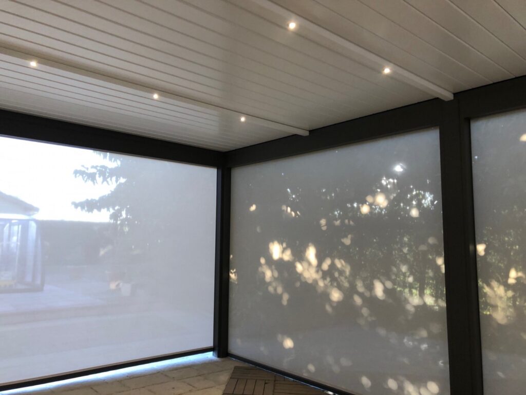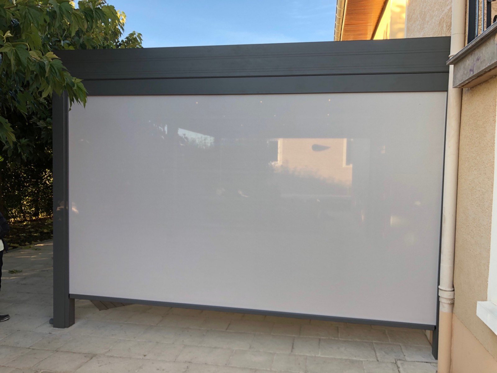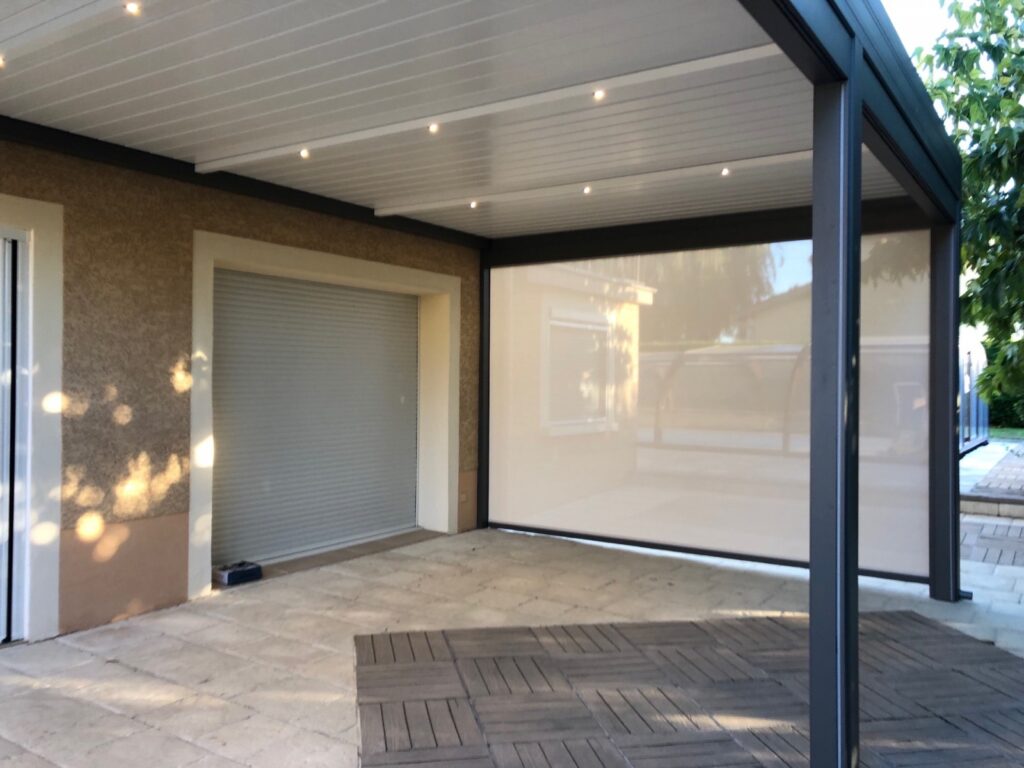 Cette pergola a aussi 3 barres de spots LED pour éclairer les soirées. En option, nous avons quatre stores screen motorisés, zippés, enroulables en coffre pour cette pergola, afin de protéger la terrasse des vents et des intempéries non désirés.