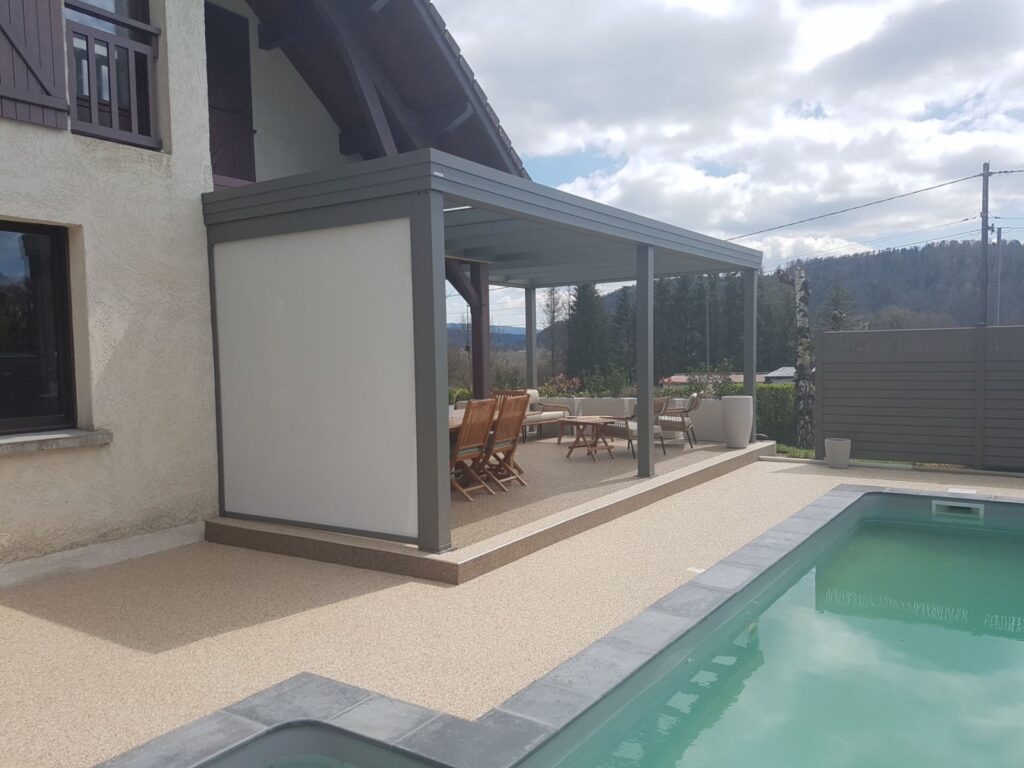 Cette pergola Jade est installée avec un store screen motorisé à télécommande afin d’éviter au vent de s’engouffrer et d’empêcher l’utilisation optimal de l’espace créer.