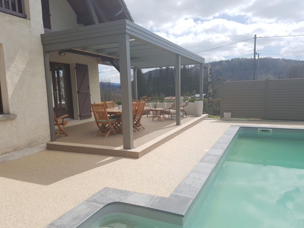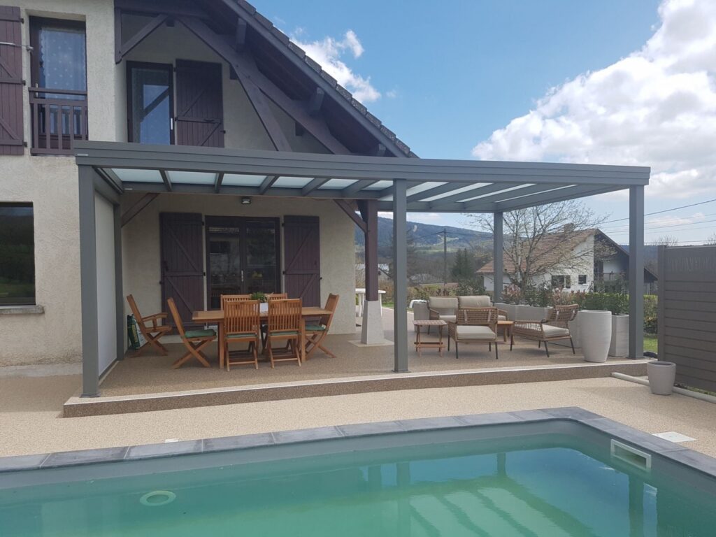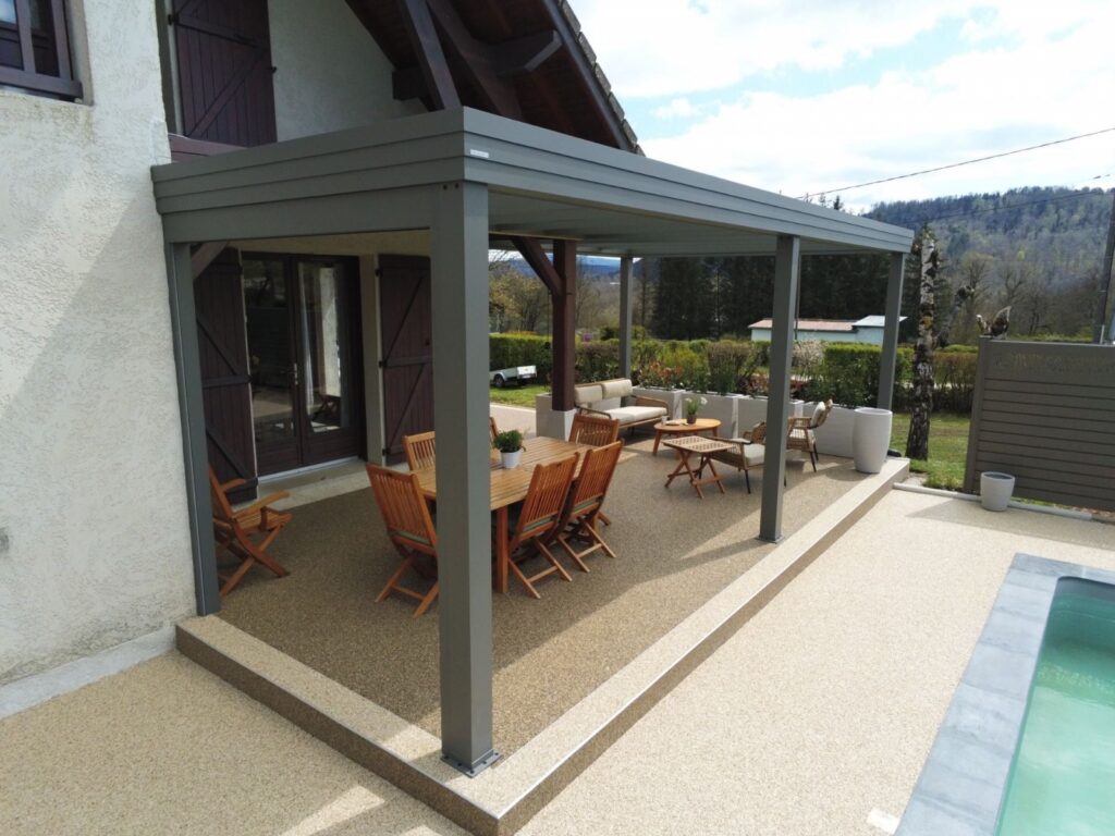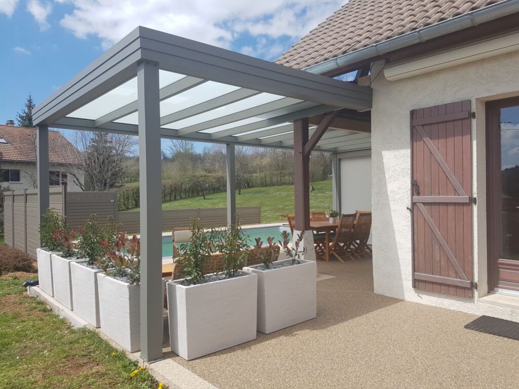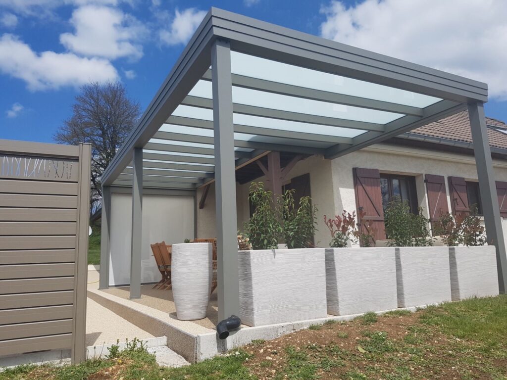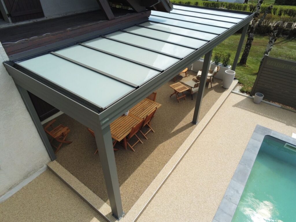 Cette construction, installée à Hauteville Lompnes, est en Aluminium couleur gris quartz RAL 7039 pour correspondre aux barrières existantes. En toiture, le remplissage a été prévu avec du simple vitrage feuilleté 44.2 opale pour ne pas perdre trop de luminosité et éviter de trop chauffer.