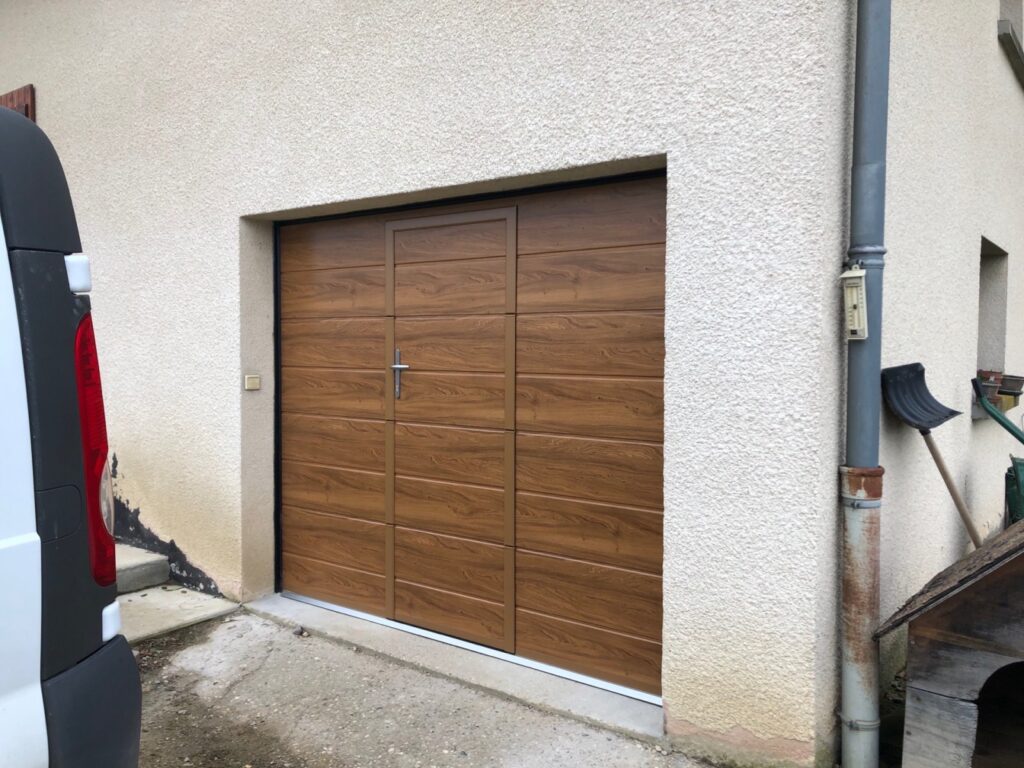 Encore une réalisation de l’entreprise Heinrich SAS à Polliat à 10 km de Bourg en Bresse, une porte de garage sectionnelle chêne clair avec portillon intégré. Le fabricant Fame propose cette porte de garage motorisée ou manuelle.