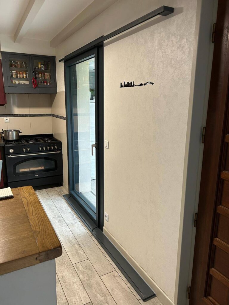 Comme vous pouvez le voir sur les photos, la porte coulisse contre le mur via un système de rails ce qui permet un gain de place et facilite le passage d’une pièce à l’autre.