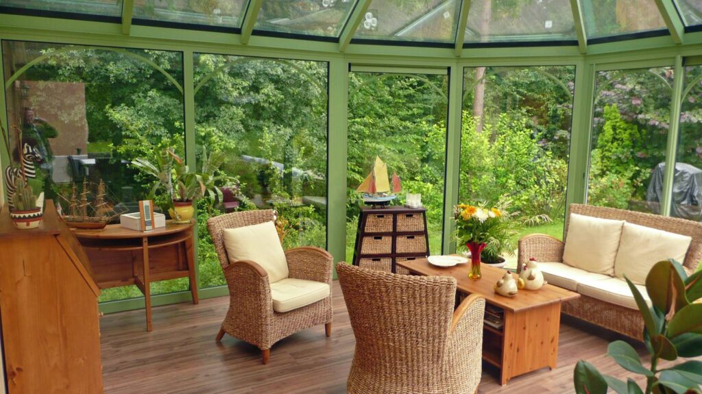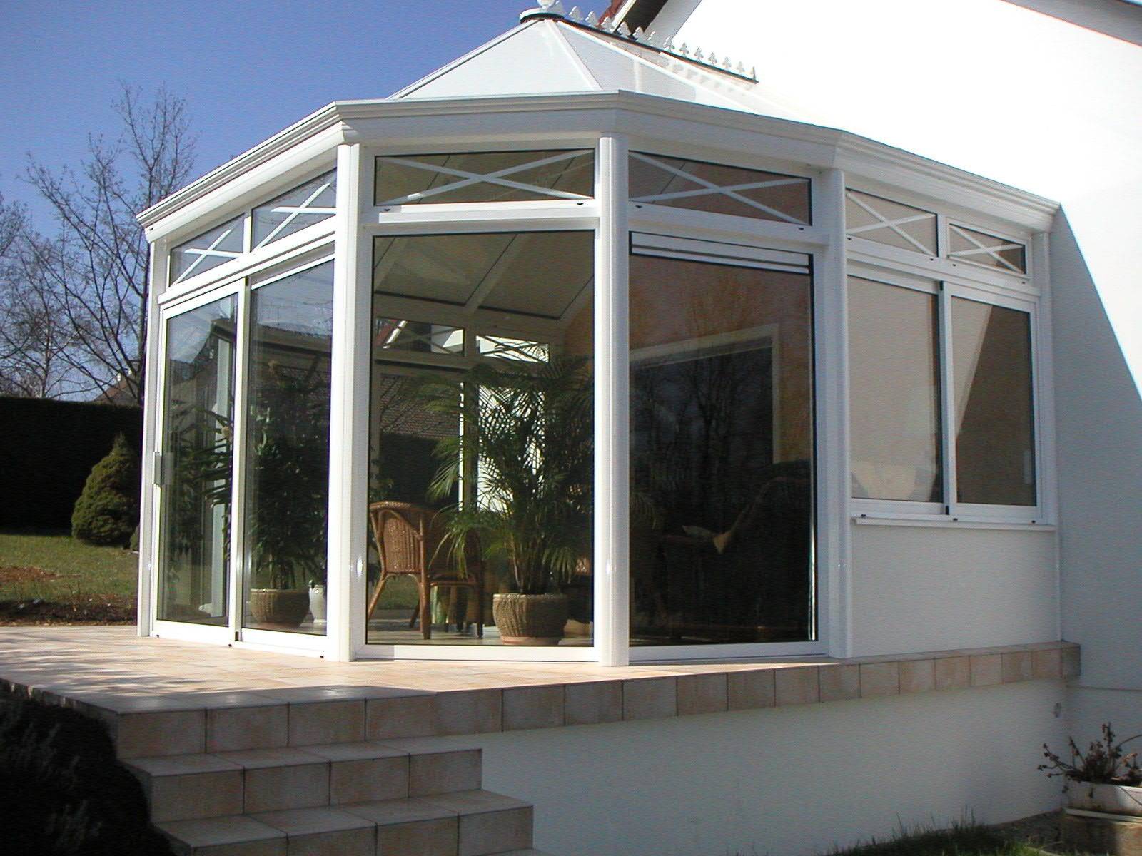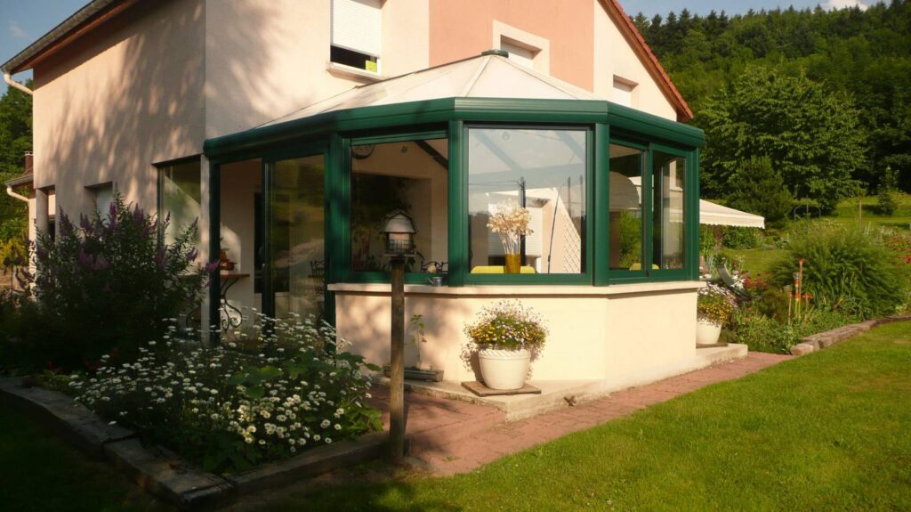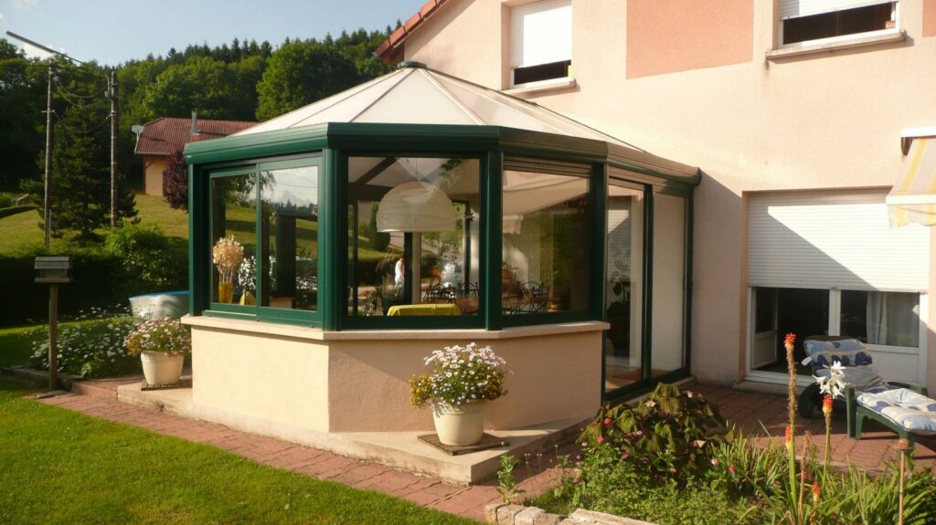 Véranda Véranco avec toiture à double pente et quatre pans coupés à Buellas dans l’Ain par l’entreprise HEINRICH – Modèle Victorienne
