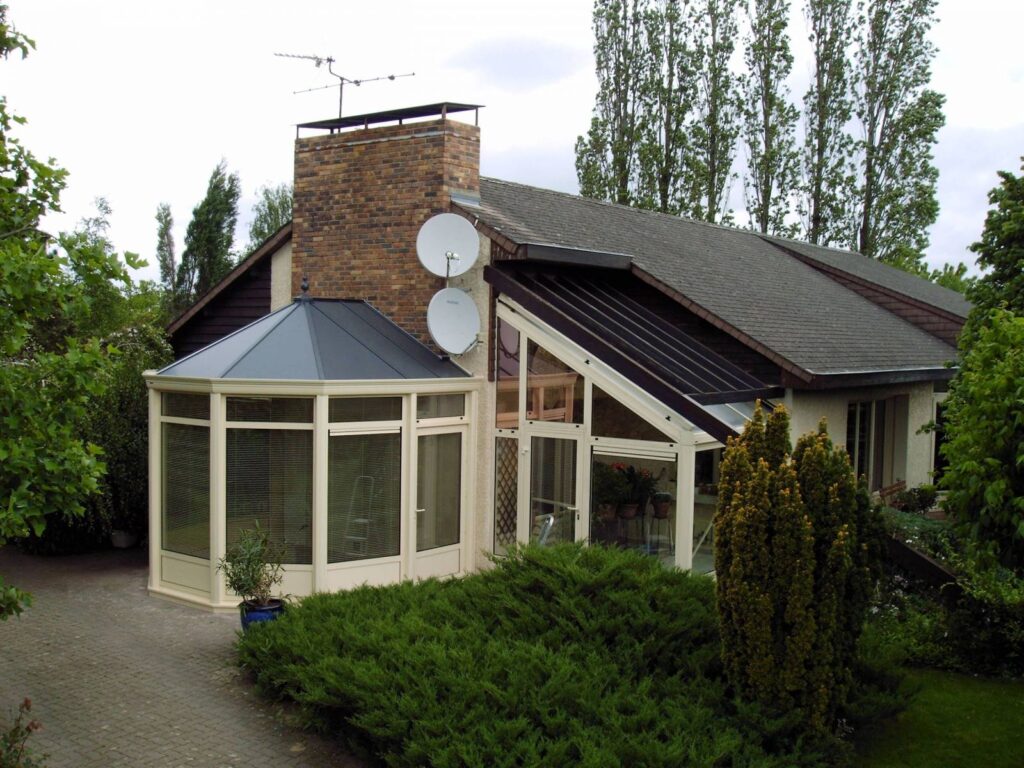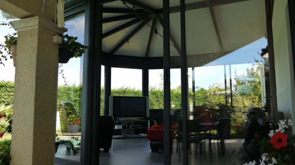 La véranda de chez Veranco modèle Victorienne est composée d’une partie rayonnante à l’avant , d’une partie double pente à l’arrière et de 4 pans coupés pour la façade.