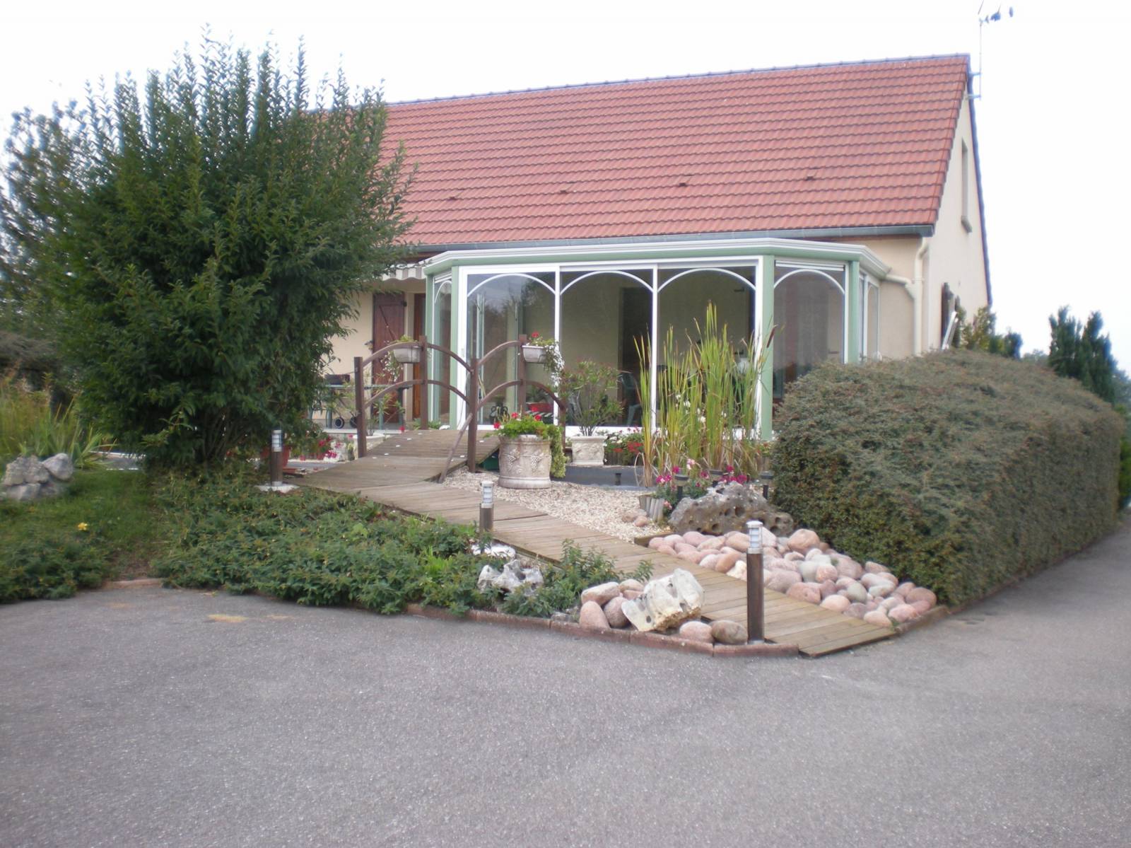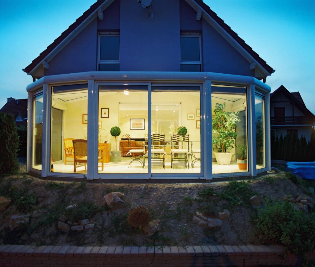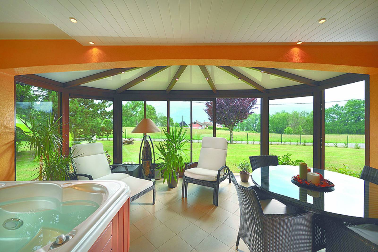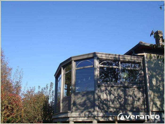 La véranda diamant de VERANCO a été pensée pour former une véranda très arrondie, en combinant plusieurs pans coupés en façade, une toiture rayonnante sur les côté et une toiture droite centrale.